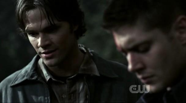 Dean court vers son frère pour le retenir. Il le serre contre lui et voit qu'il saigne. Il lui tient la tête et lui promet qu'il va s'occuper de lui,qu'il va le remettre à neuf, que c'est son boulot, de surveiller son "emmerdeur" de frère.Il lui dit qu'il ne va pas le laisser tomber.Mais Sam ne réagit plus et ne l'entend plus. Dean l'appelle mais sans effet. Il le prend dans ses bras, crie son nom et pleure...